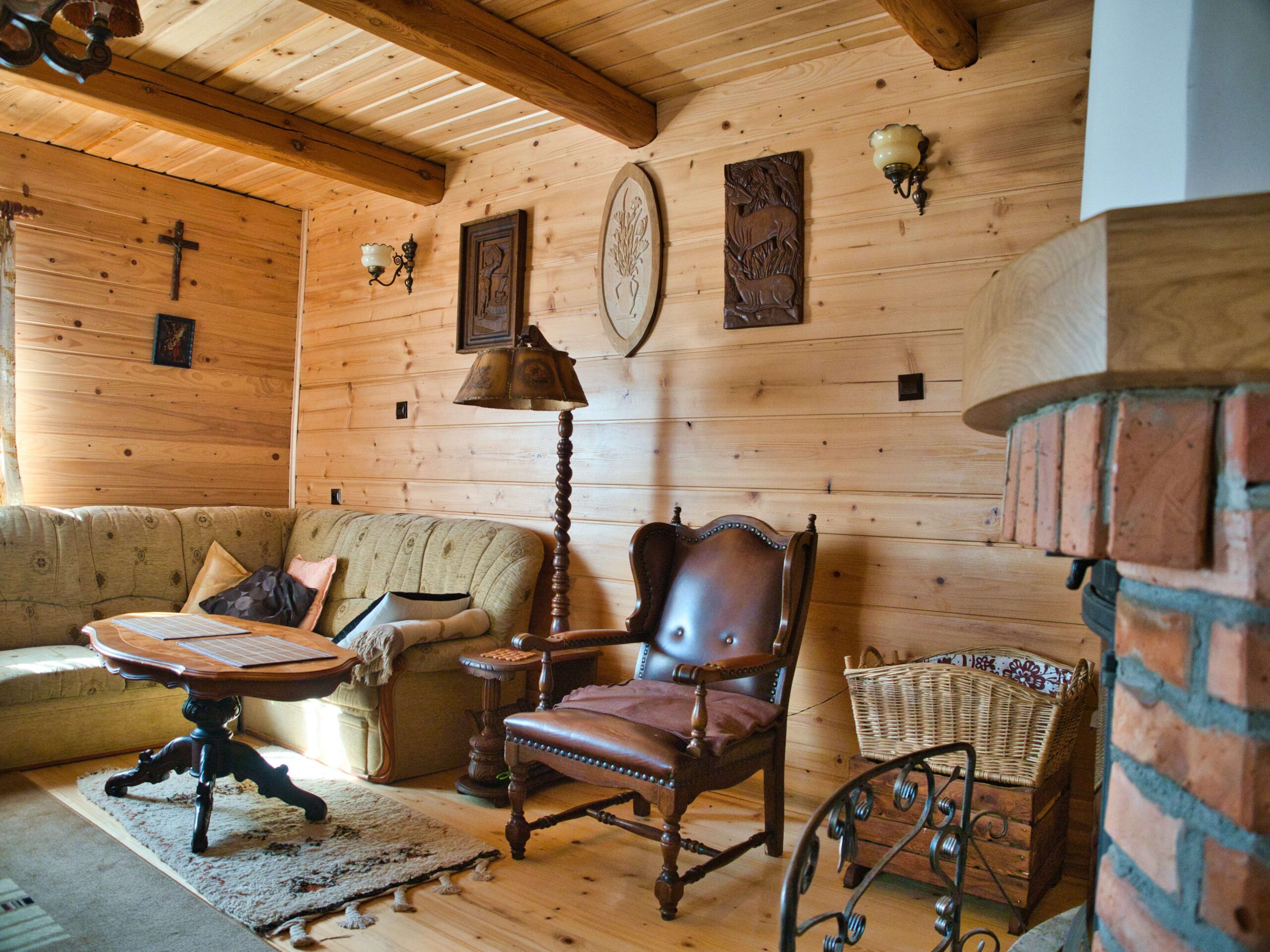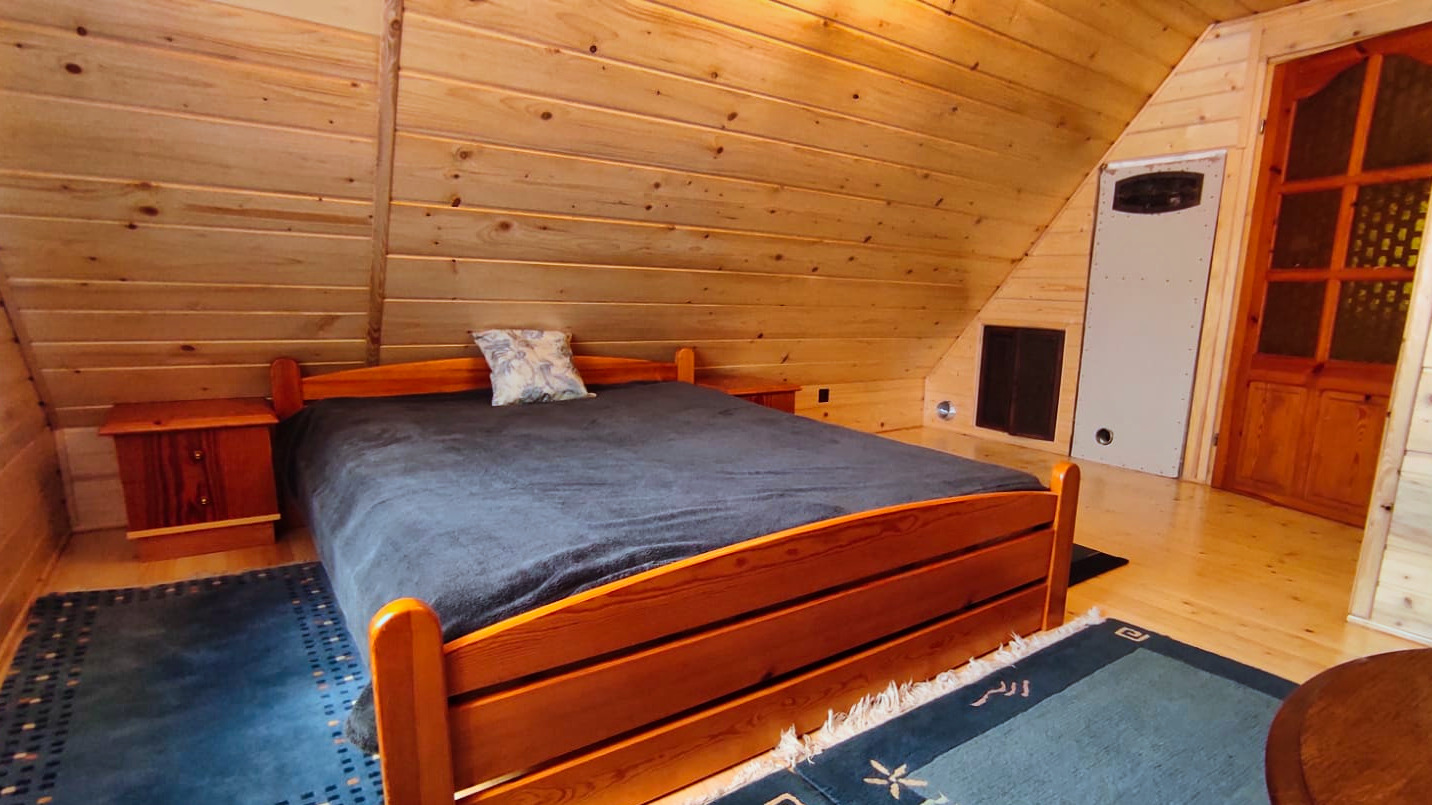 Dom dwukondygnacyjny, zbudowany z drewnianych bali. Ogrzewany kominkiem z możliwością przygotowania własnych posiłków.