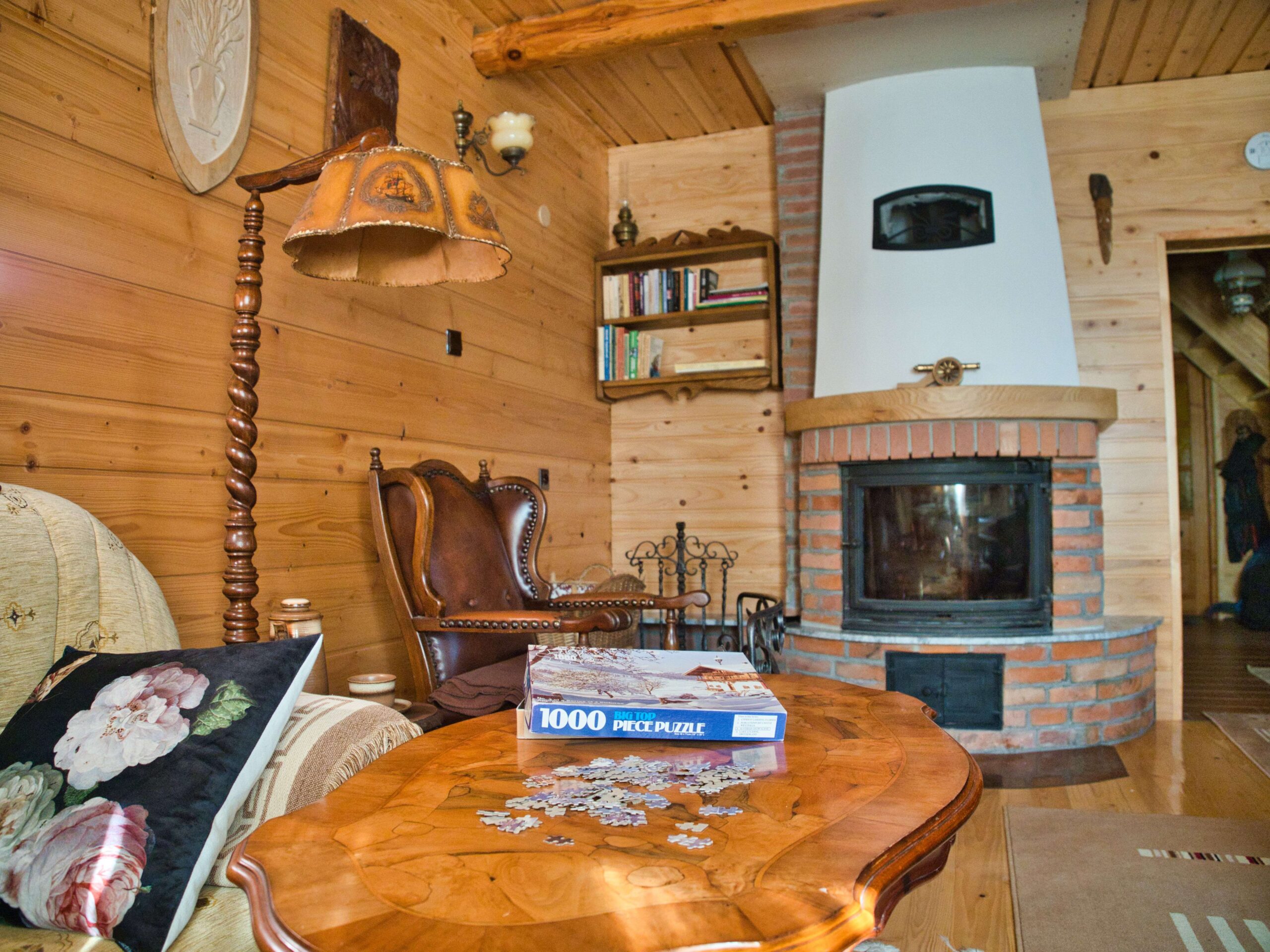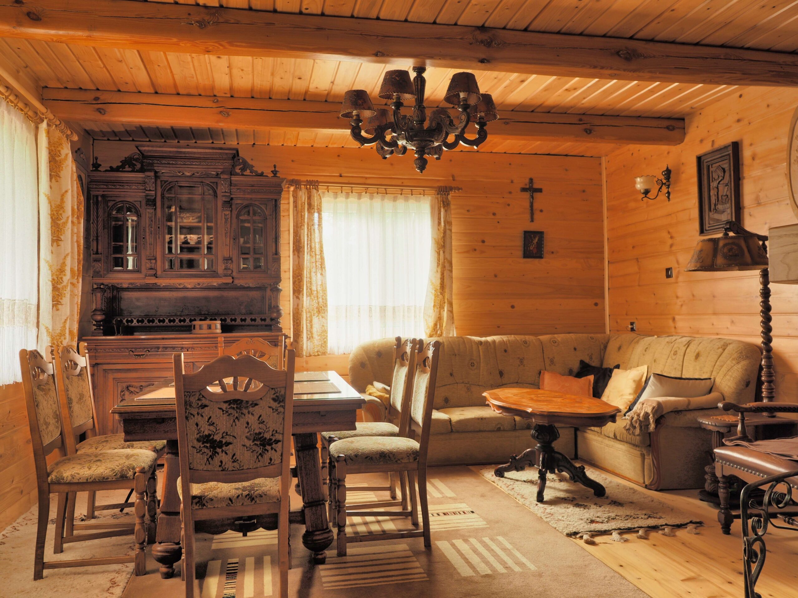 - Salon (kominek, komplet wypoczynkowy, telewizor, stół dla sześciu osób)